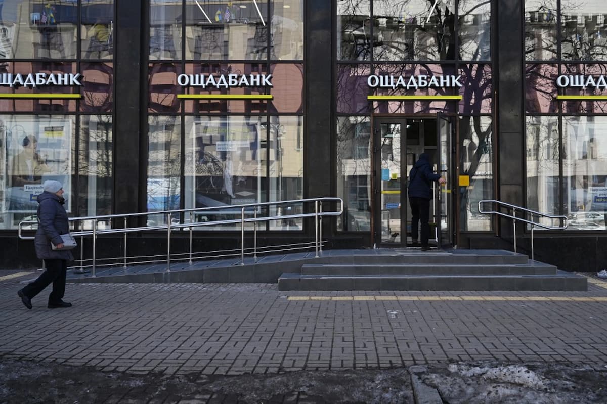 A man enters an office of The State Savings Bank of Ukraine, or Oschadbank, in the city of Kyiv on March 6, 2026, amid the Russian invasion of Ukraine. (Photo by Genya SAVILOV / AFP)